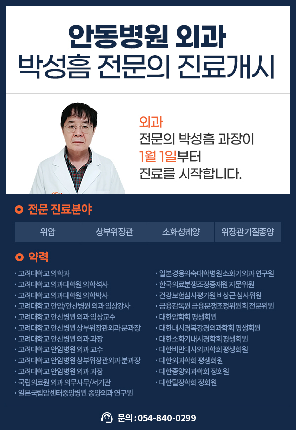 내용2026년 1월 1일부터 진료 시작합니다. (안동병원 2층 남관 외과) 진료분야 : 위암ㅣ상부위장관ㅣ소화성궤양ㅣ위장관기질종양