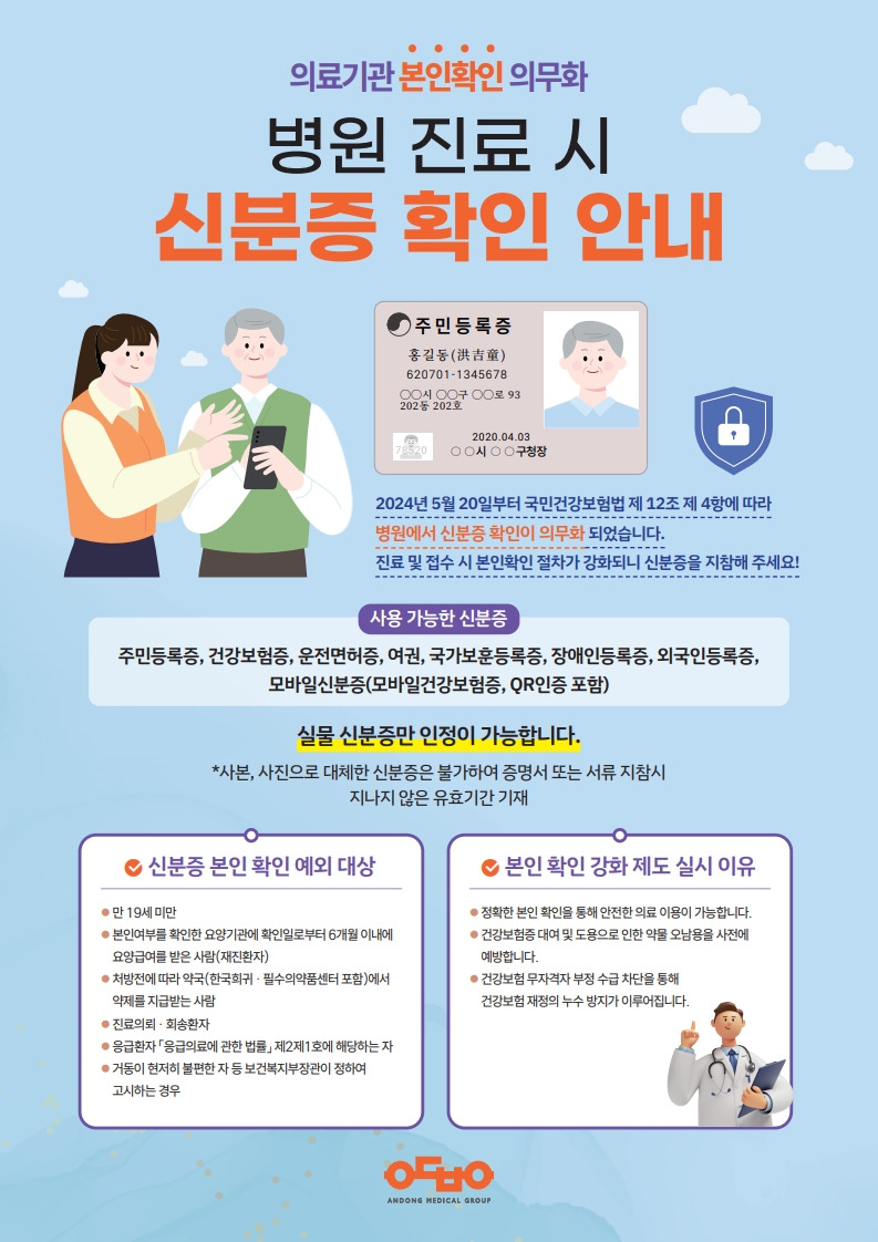 병원지료시 신분증확인안내 2024년5월20일부터 국민건강보험법제12조제4항 에 따라 병원에서 신분증확인이 의무화되었습니다. 진료및접수시 본인확인절차가 강화되니 신분증을 지참해주세요! 사용가능한신분증 주민등록증,건강보험증,운전면허증,여권,국가보훈등록증,장애인등록증,외국인등록증,모바일신분증(모바일건강보험증,QR인증포함) 실물신분증만인정이가능합니다. *사보느사진으로대체한신분증은불가하여 증명서 또는 서류 지참시 지나지 않은 유효기간 기재 신분증 본인 확인 예외 대상 만 19세 미만 본인여부를 확인한 요양기관에 확인일로부터 6개월 이내에 요양급여를 받은 사람(재진환자) 처방전에 따라 약국(한국회귀 · 필수의약품센터 포함)에서 약제를 지급받는 사람 진료의뢰 · 회송환자 응급환자「응급의료에 관한 법를」제2제1호에 해당하는 자 거동이 현저히 불편한 자 등 보건복지부장관이 정하여 고시하는 경우 본인 확인 강화 제도 실시 이유 정확한 본인 확인을 통해 안전한 의료 이용이 가능합니다. 건강보험종 대여 및 도용으로 인한 약물 오남용을 사전에 예방합니다. 건강보험 무자격자 부정 수급 차단을 통해 건강보험 재정의 누수 방지가 이루어집니다. 안동병원 |