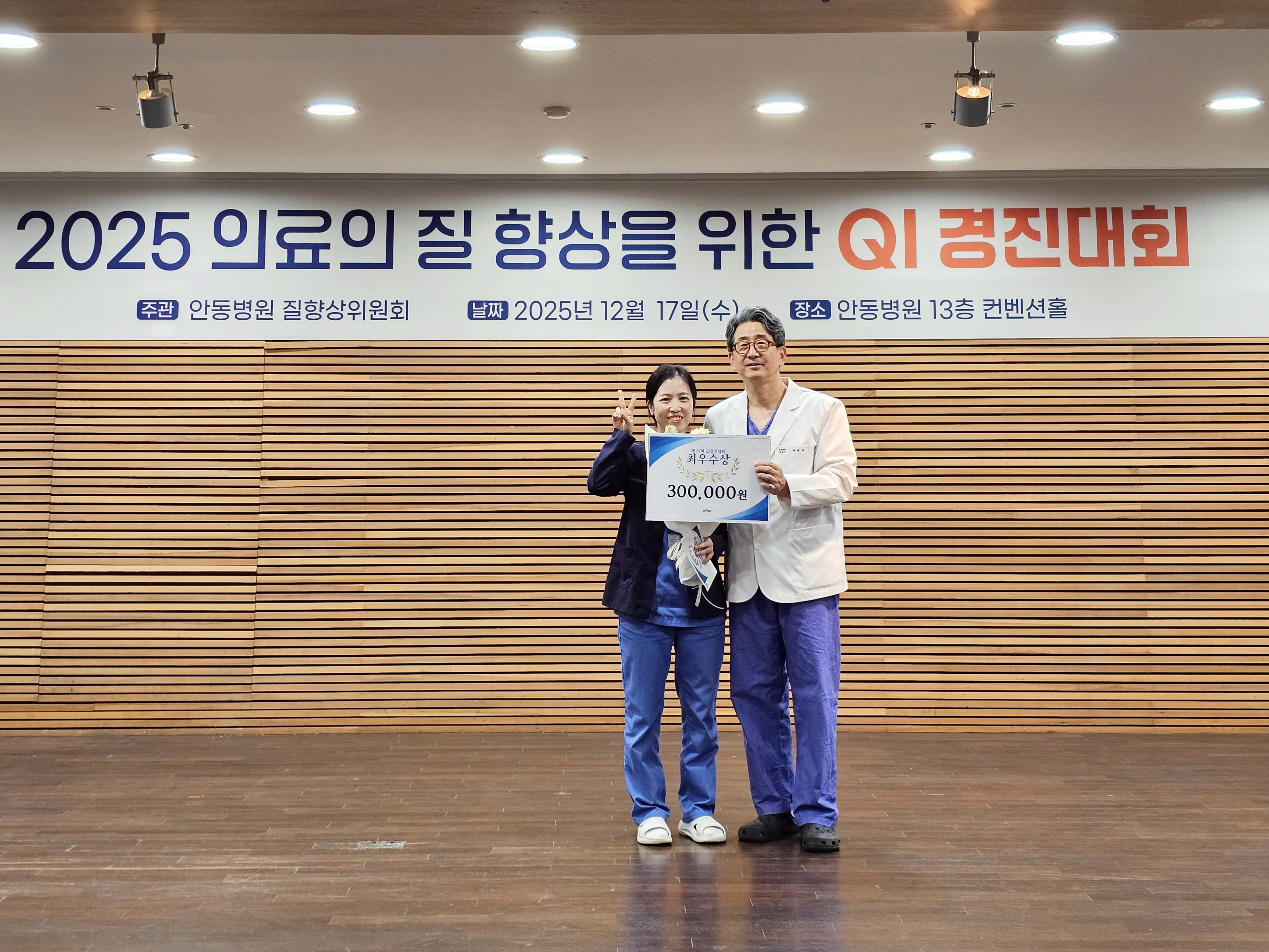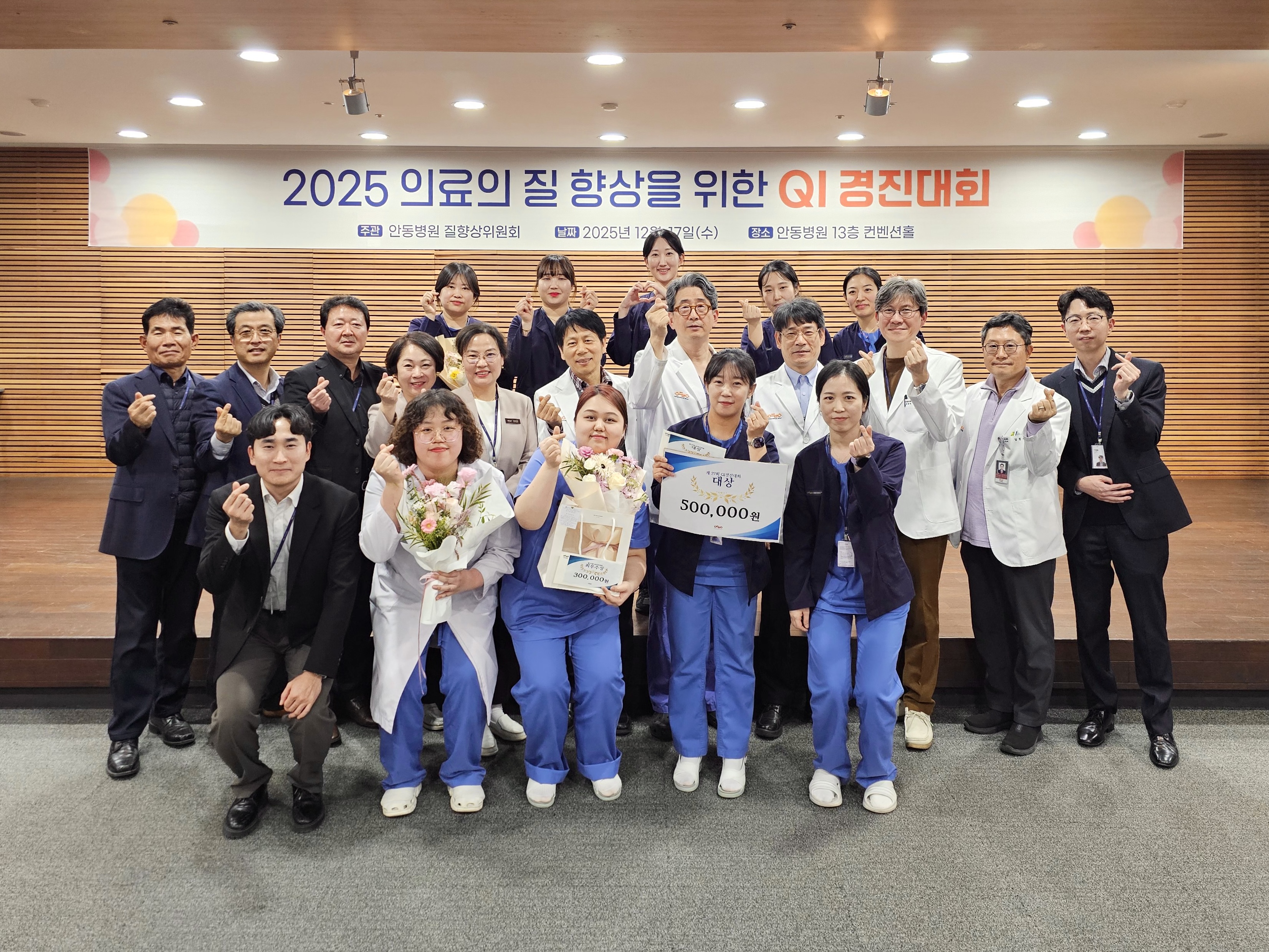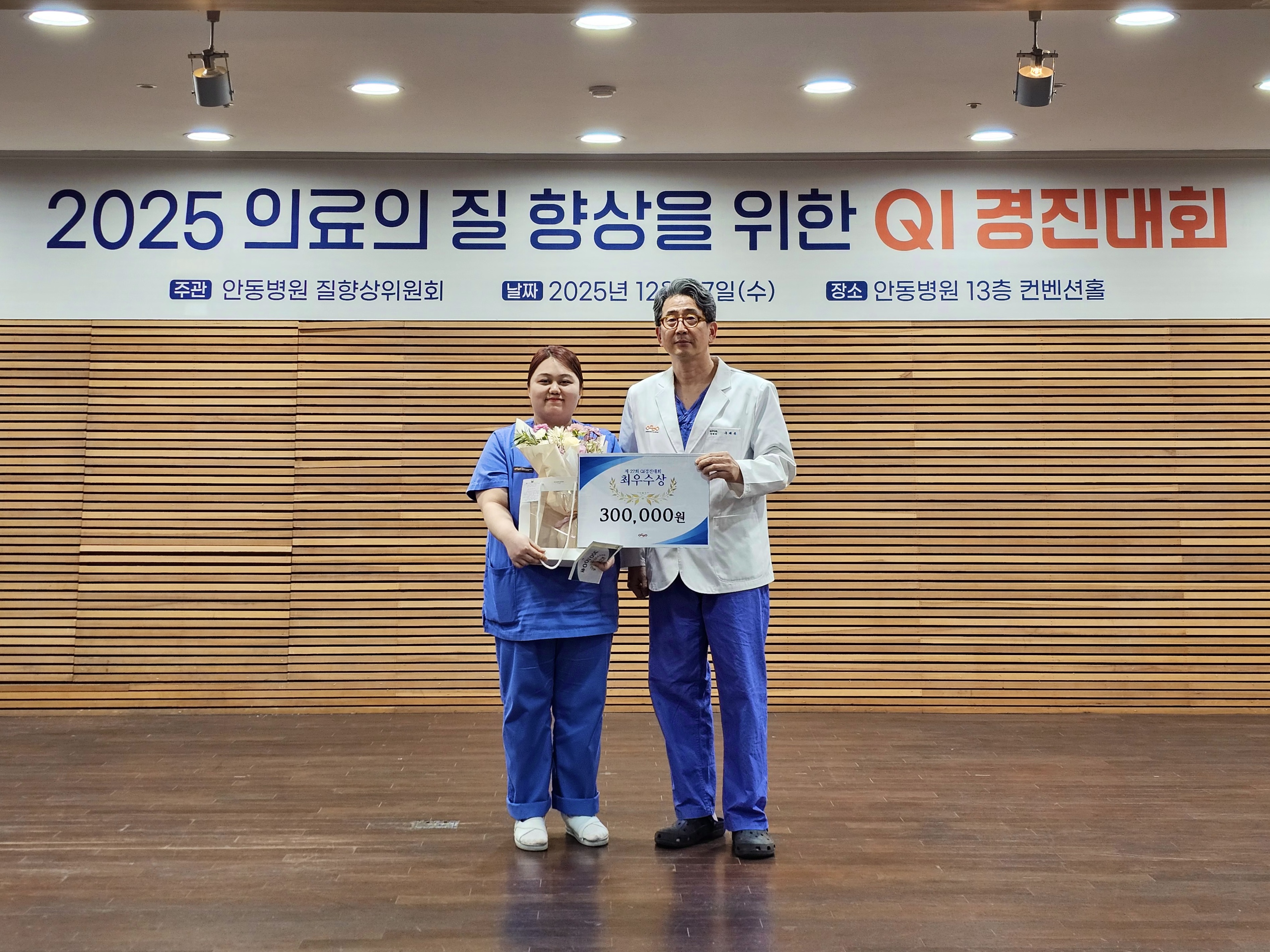 의료법인 안동의료재단 안동병원(이사장 강신홍)은 지난 17일 13층 컨벤션홀에서 열린 2025년 QI경진대회에서 우리는내과(104,114본관,104남관간호파트)팀이 'ERCP간호 표준화를 통한 환자 만족도 향상'을 주제로 대상을 수상했다. QI경진대회는 업무 연관성이 높은 부서가 추진한 의료질 향상 개선활동으로 올해는 총 30개 팀이 참여했다. 활동주제는 감염관리 5팀, 고객만족도 향상 6팀, 업무개선 9팀, 환자안전 10팀이 경합을 벌였다. 심사는 안동병원 질 향상위원회 위원을 우선으로 위촉하였으며, 병원장 추천과 각 부의 대표자로 위촉됐다.