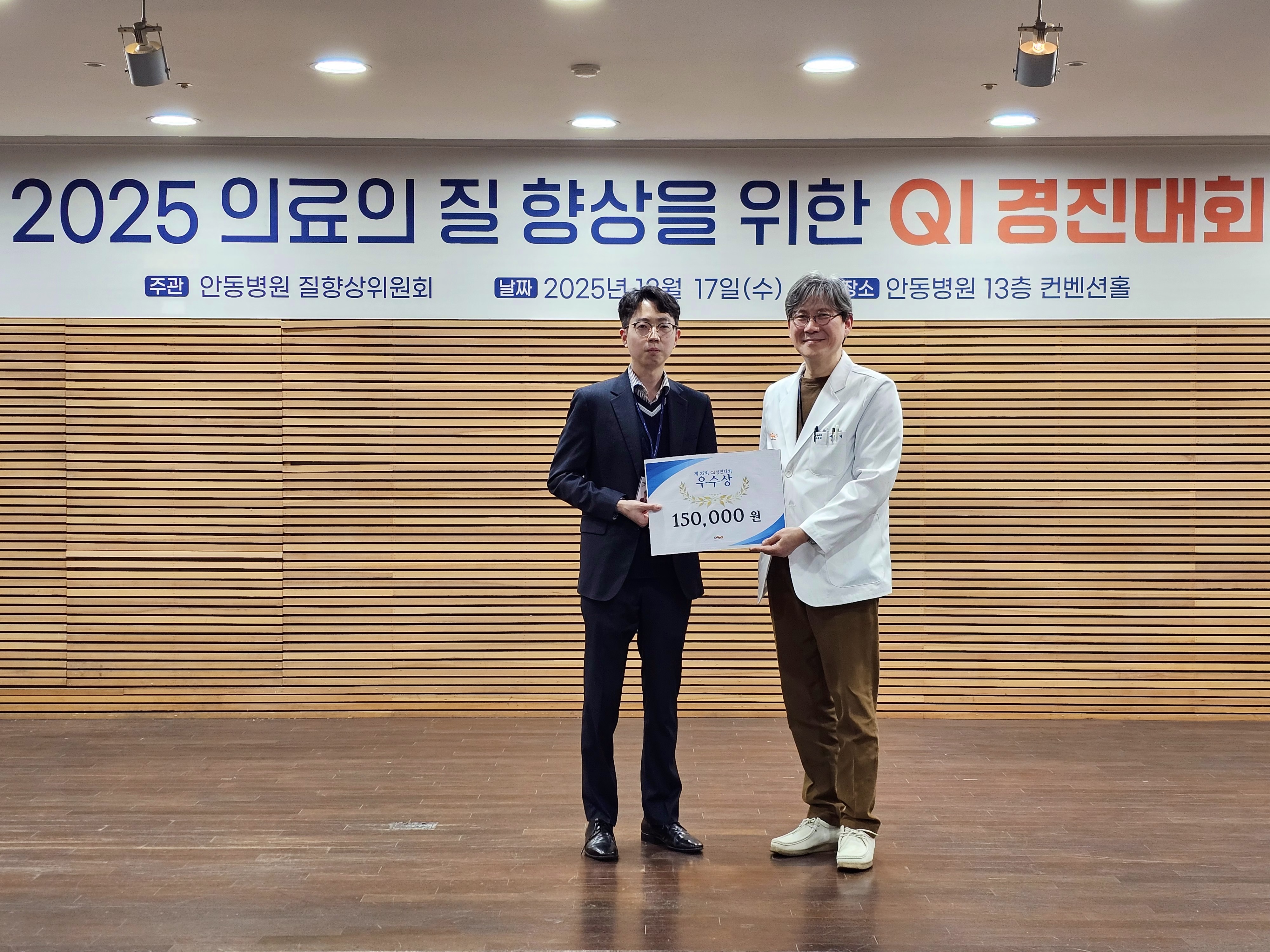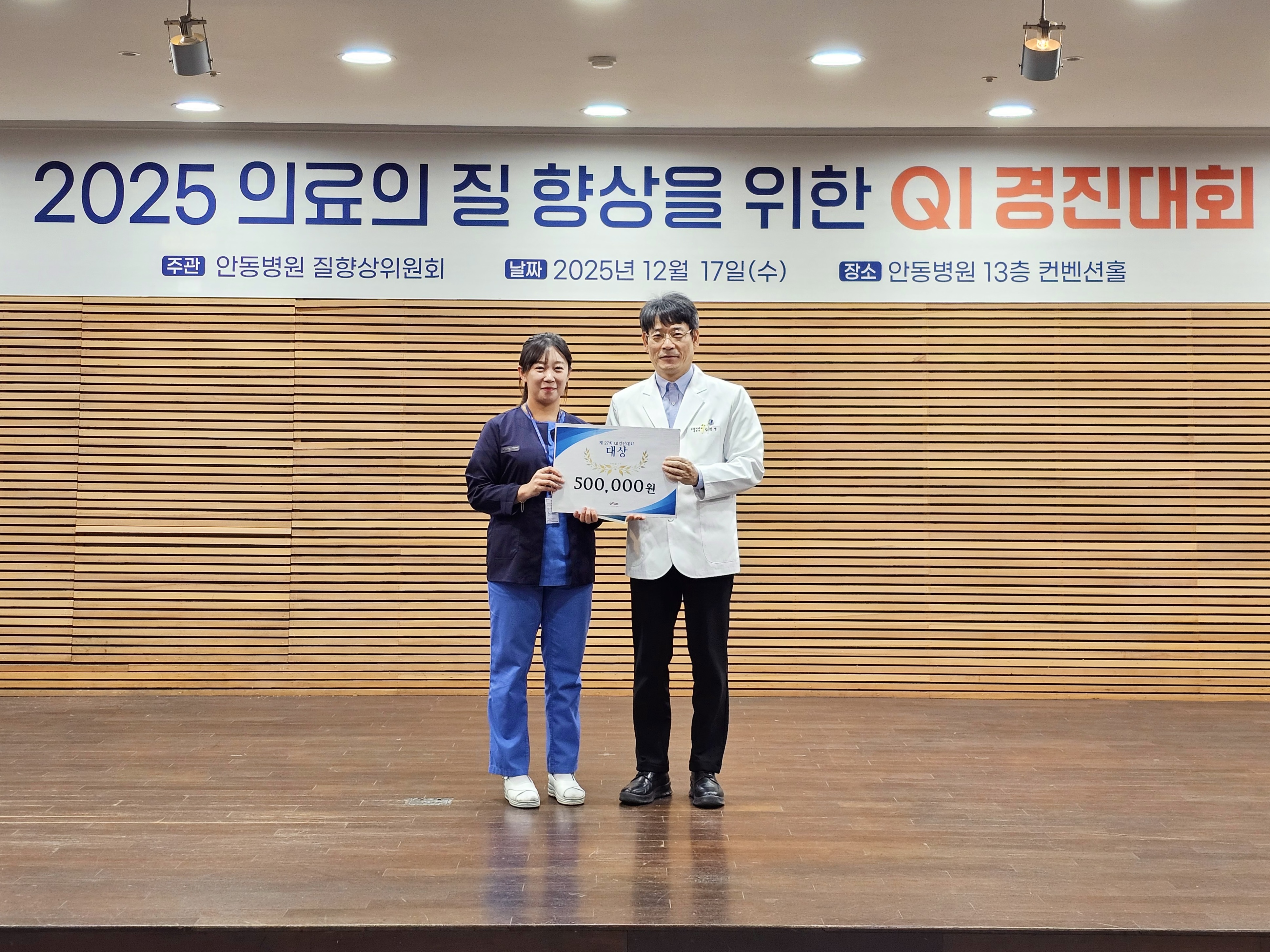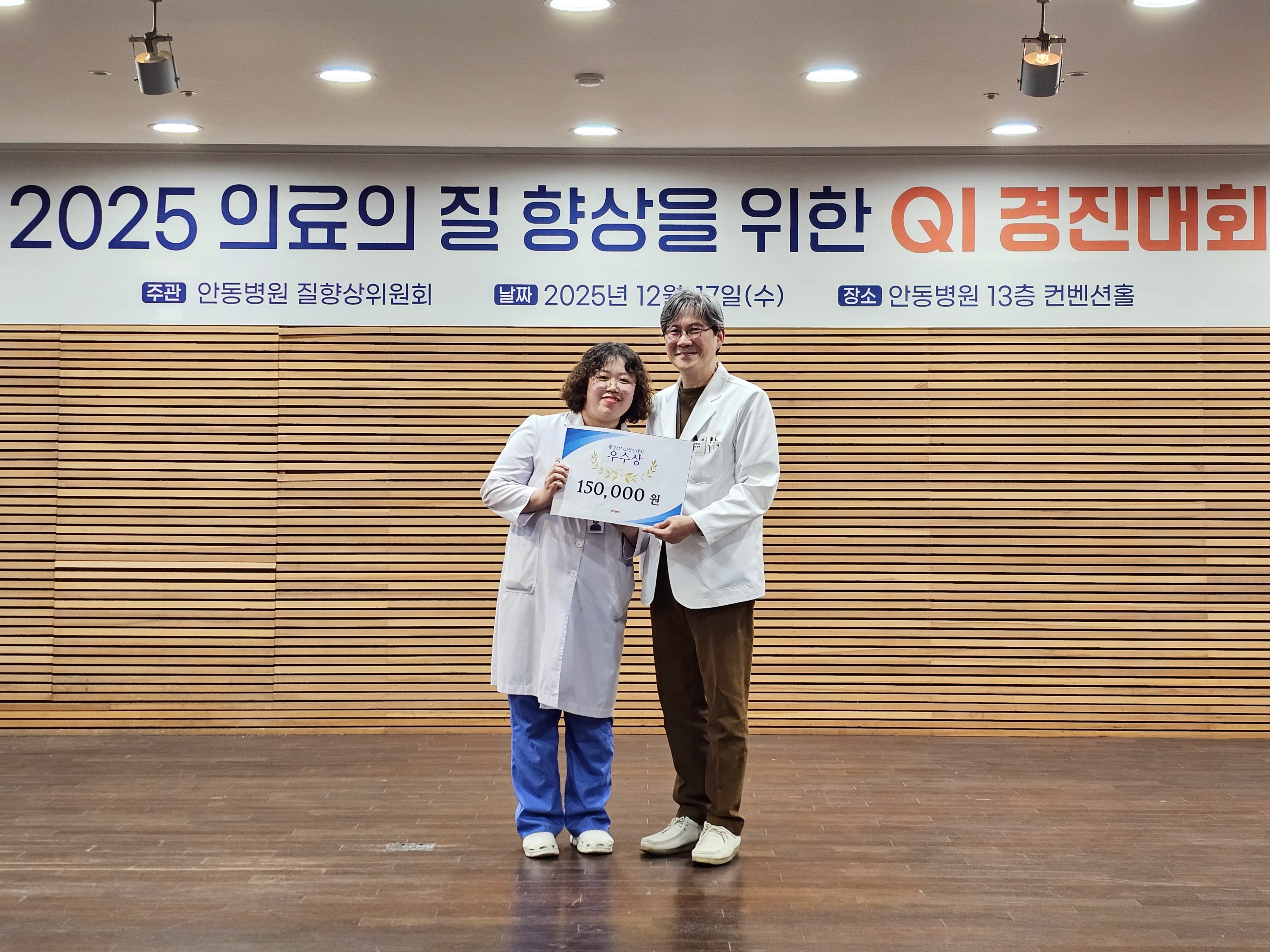 의료법인 안동의료재단 안동병원(이사장 강신홍)은 지난 17일 13층 컨벤션홀에서 열린 2025년 QI경진대회에서 우리는내과(104,114본관,104남관간호파트)팀이 'ERCP간호 표준화를 통한 환자 만족도 향상'을 주제로 대상을 수상했다. QI경진대회는 업무 연관성이 높은 부서가 추진한 의료질 향상 개선활동으로 올해는 총 30개 팀이 참여했다. 활동주제는 감염관리 5팀, 고객만족도 향상 6팀, 업무개선 9팀, 환자안전 10팀이 경합을 벌였다. 심사는 안동병원 질 향상위원회 위원을 우선으로 위촉하였으며, 병원장 추천과 각 부의 대표자로 위촉됐다.