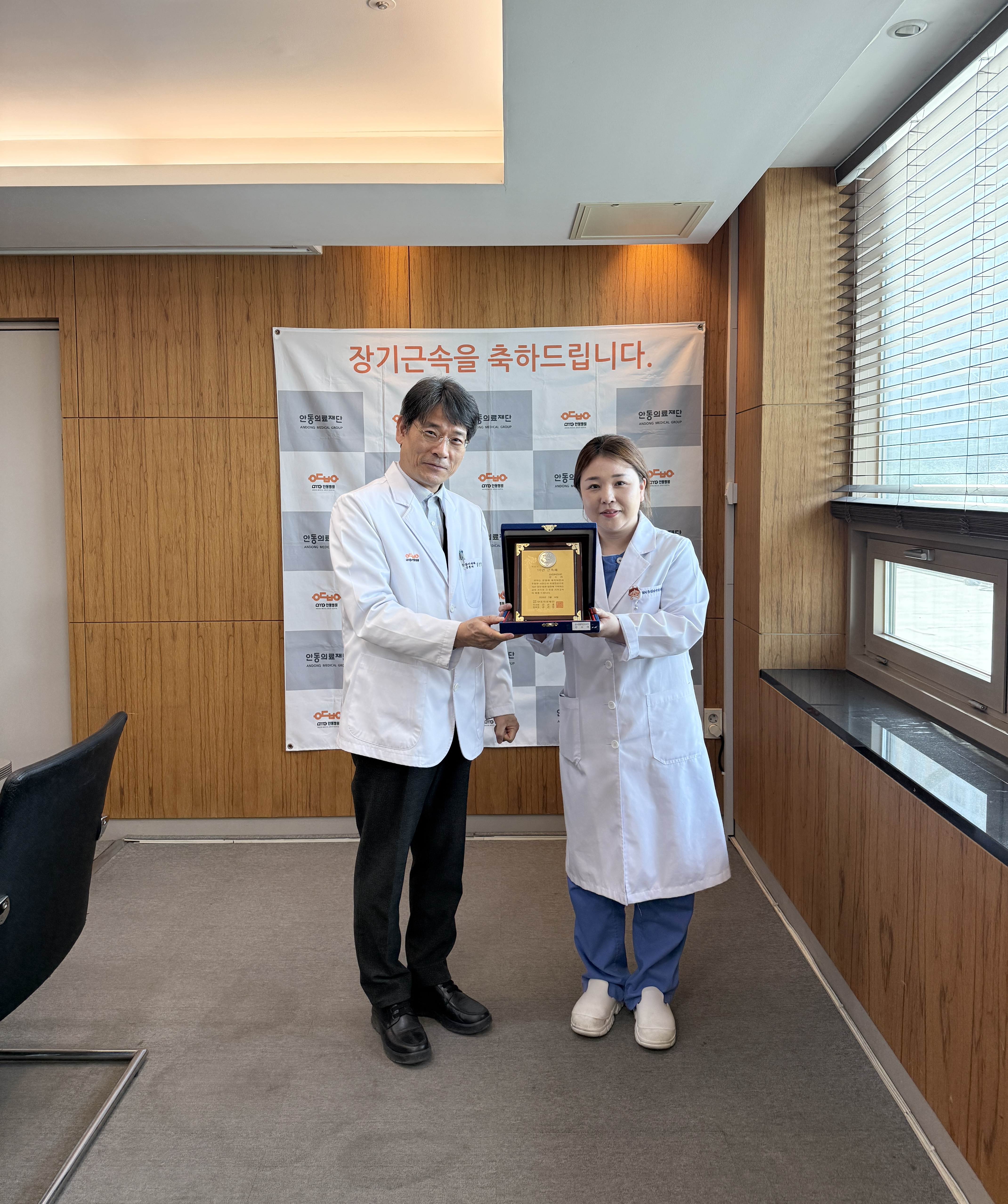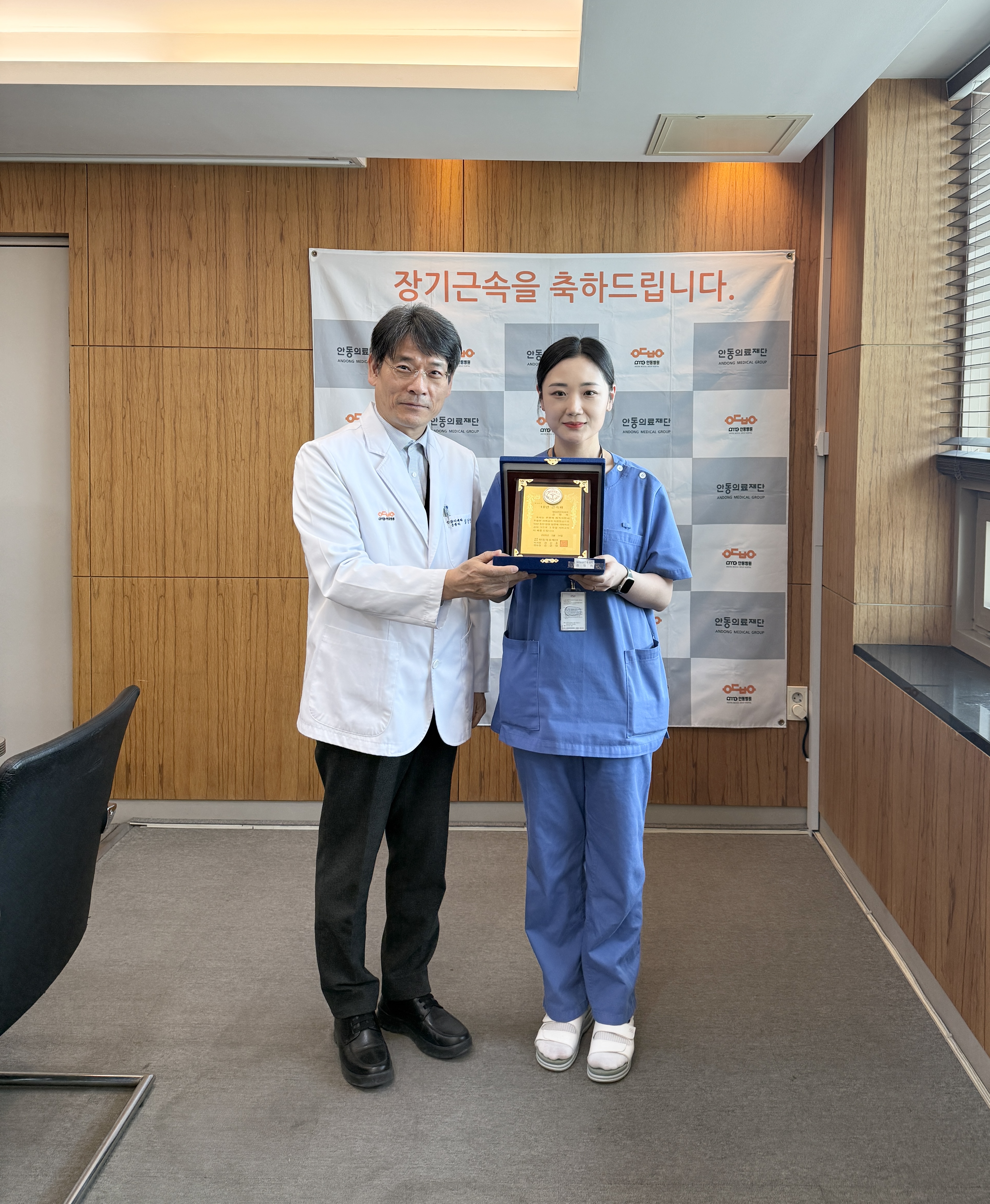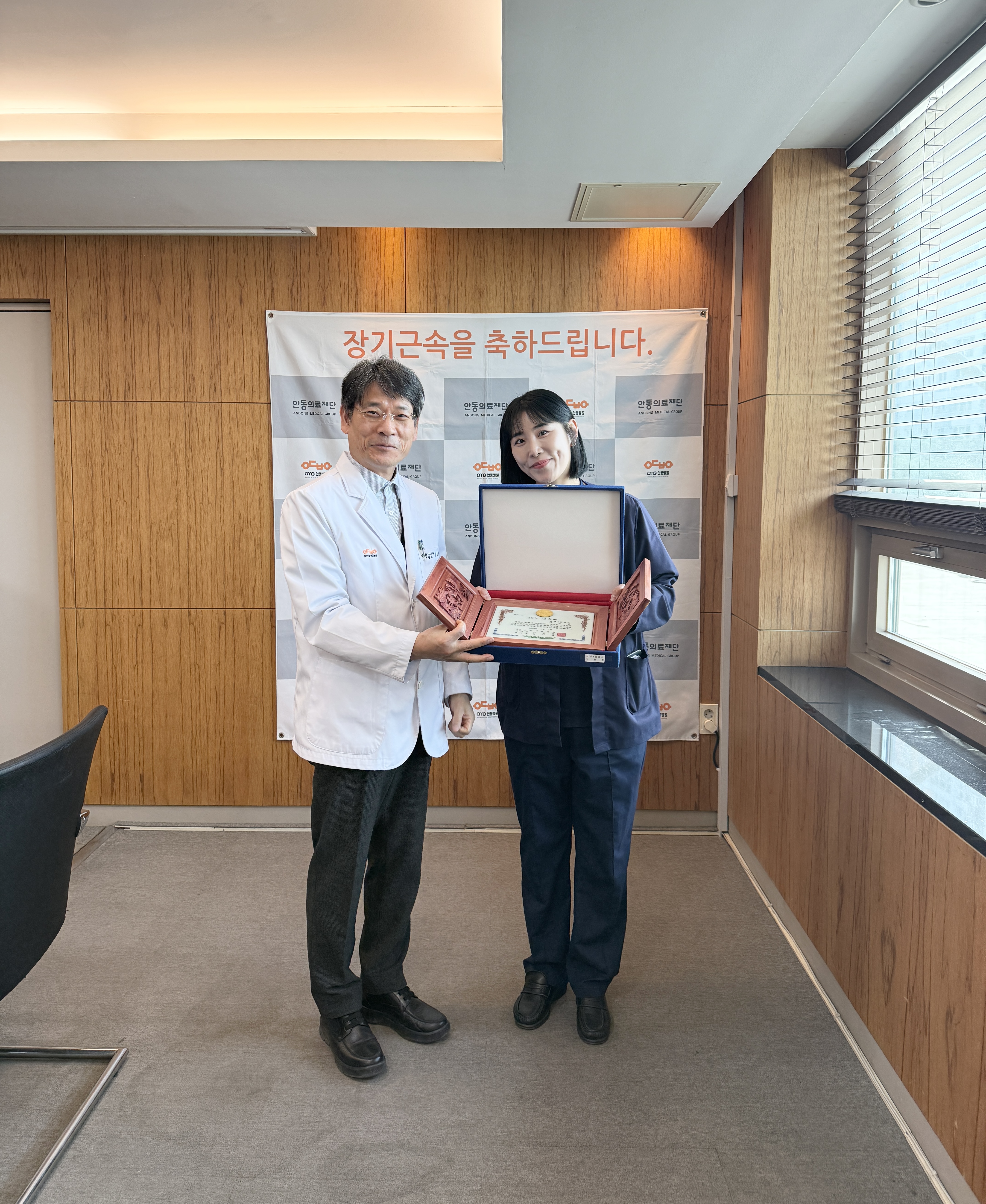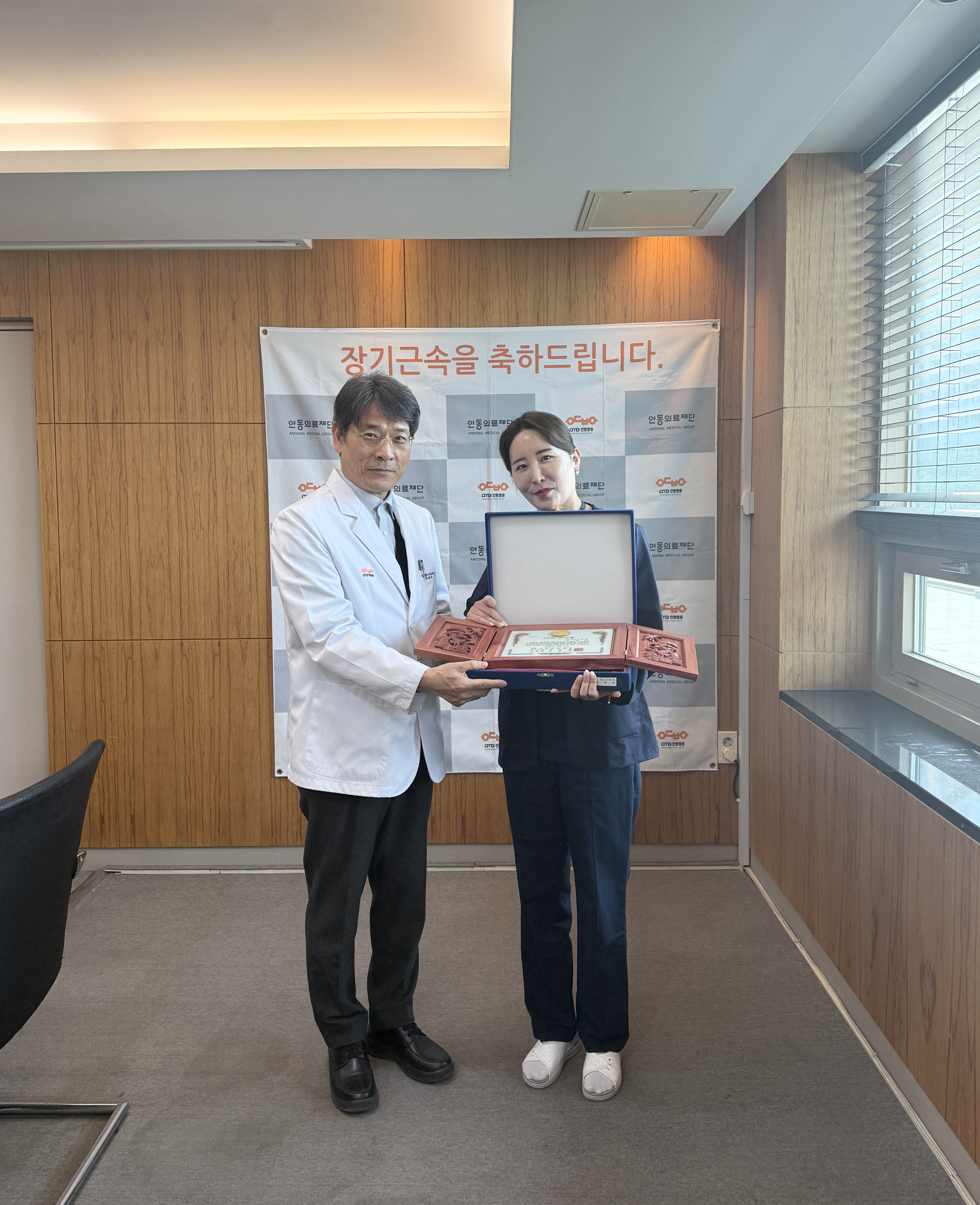 내용안동의료재단 3월 장기근속직원 포상 안동의료재단 안동병원(이사장 강신홍) 3월 장기근속 포상이 3월 26일 목요일 오후 4시 2층 회의실에서 열렸다.