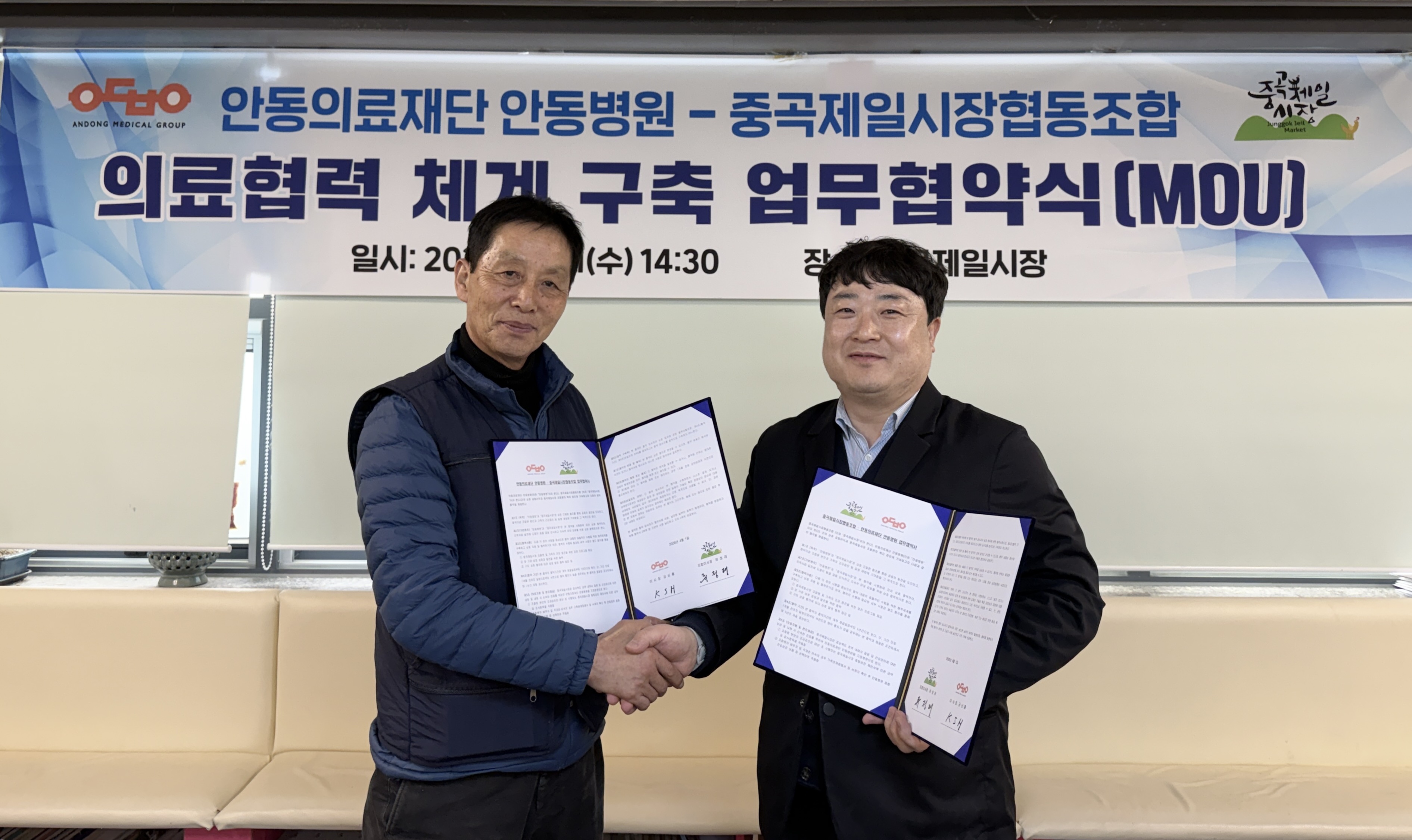 안동의료재단 안동병원(이사장 강신홍)과 중곡제일시장협동조합(조합이사장 류정래)은 지난 1일 서울 광진구 소재 중곡제일시장에서 조합원 건강권 증진을 위한 의료협력 체계 구축 업무협약(MOU)을 체결했다.