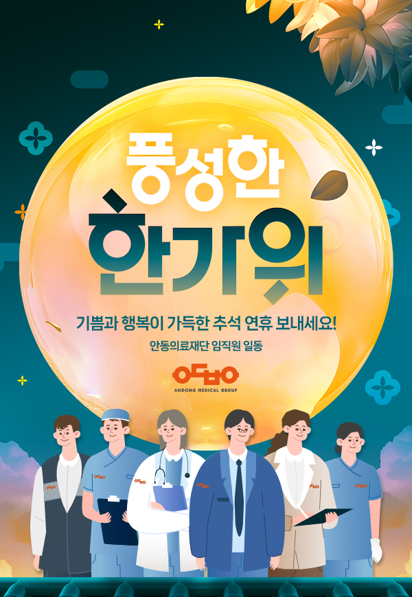 내용추석, 감사와 나눔 2025년 한가위를 맞아 풍성한 결실과 따뜻한 정이 가득하시기를 기원합니다. 안동병원은 늘 지역사회와 함께하며 건강과 행복을 지켜가는 든든한 동반자가 되겠습니다. 가족과 이웃이 함께하는 넉넉한 한가위 보내시고, 서로를 위로하고 격려하는 마음이 더 깊어지기를 진심으로 바랍니다. 2025년 추석 안동의료재단 임직원 일동 |