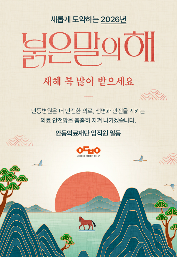 내용2026년 새해 인사 새해, 희망을 이어갑니다. 2026년 새해를 맞아 가정마다 건강과 평안이 늘 함께하시기를 기원합니다. 안동병원은 새해에도 더 안전한 의료, 생명과 안전을 지키는 든든한 의료 안전망을 촘촘히 지켜 나가겠습니다. 아울러, 한 분 한 분의 일상이 건강으로 이어질 수 있도록 언제나 가장 가까운 곳에서 함께하겠습니다. 새해에는 더 많은 웃음과 평안이 가득하시길 바랍니다. 새해 복 많이 받으십시오. 고맙습니다. 2026년 1월 1일 안동의료재단 임직원 일동