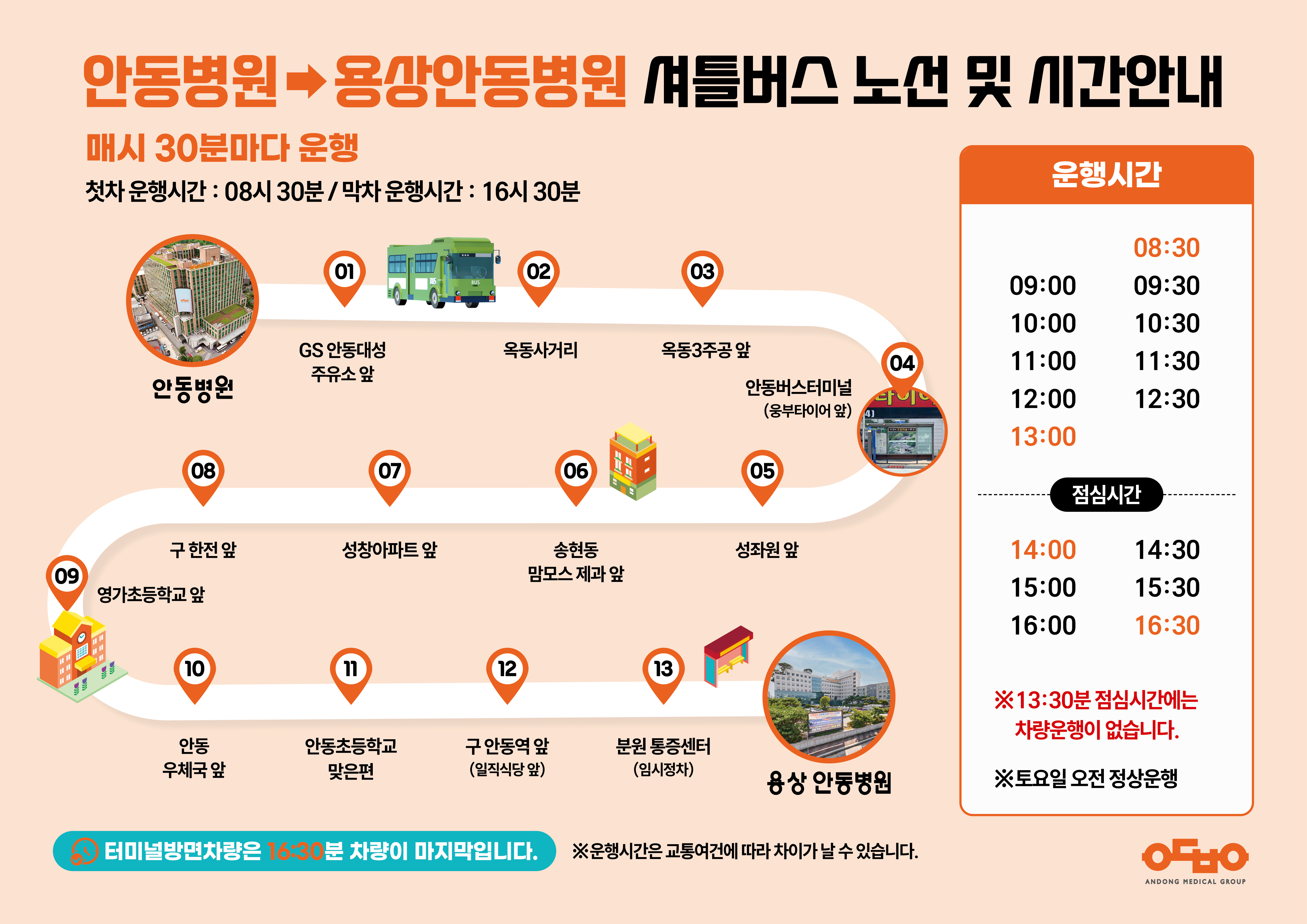 내용안동의료재단 셔틀버스 안내 • 매 30분마다 운행 • 평일 08:30-16:30 (13:30분 점심시간 미운행) • 토요일 08:30-12:30