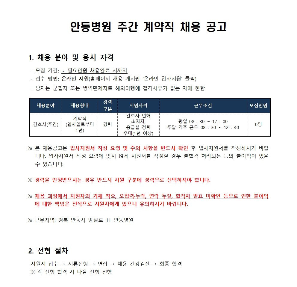 | 안동의료재단 주간 계약직(경력직 간호사) 채용 | |||